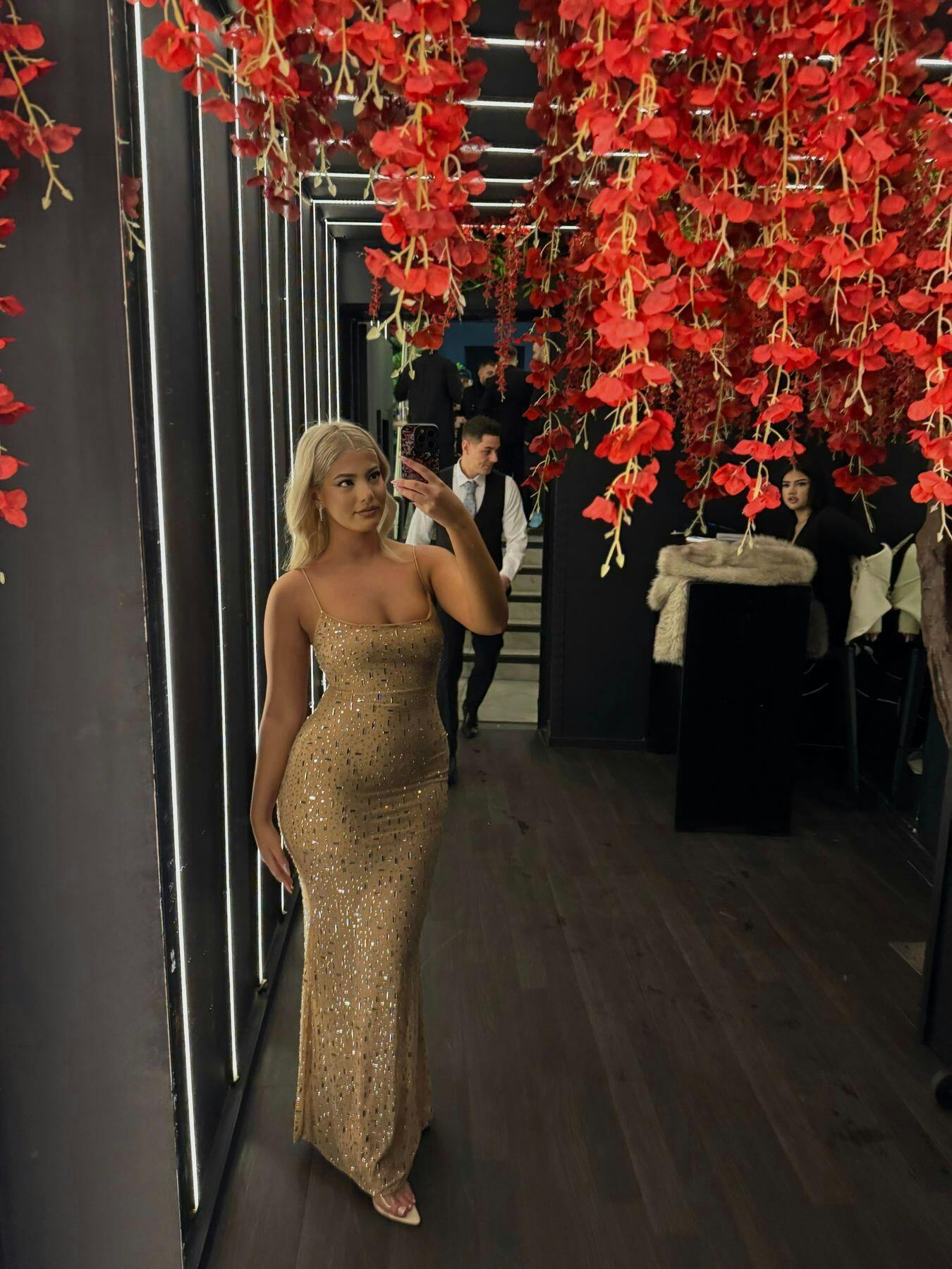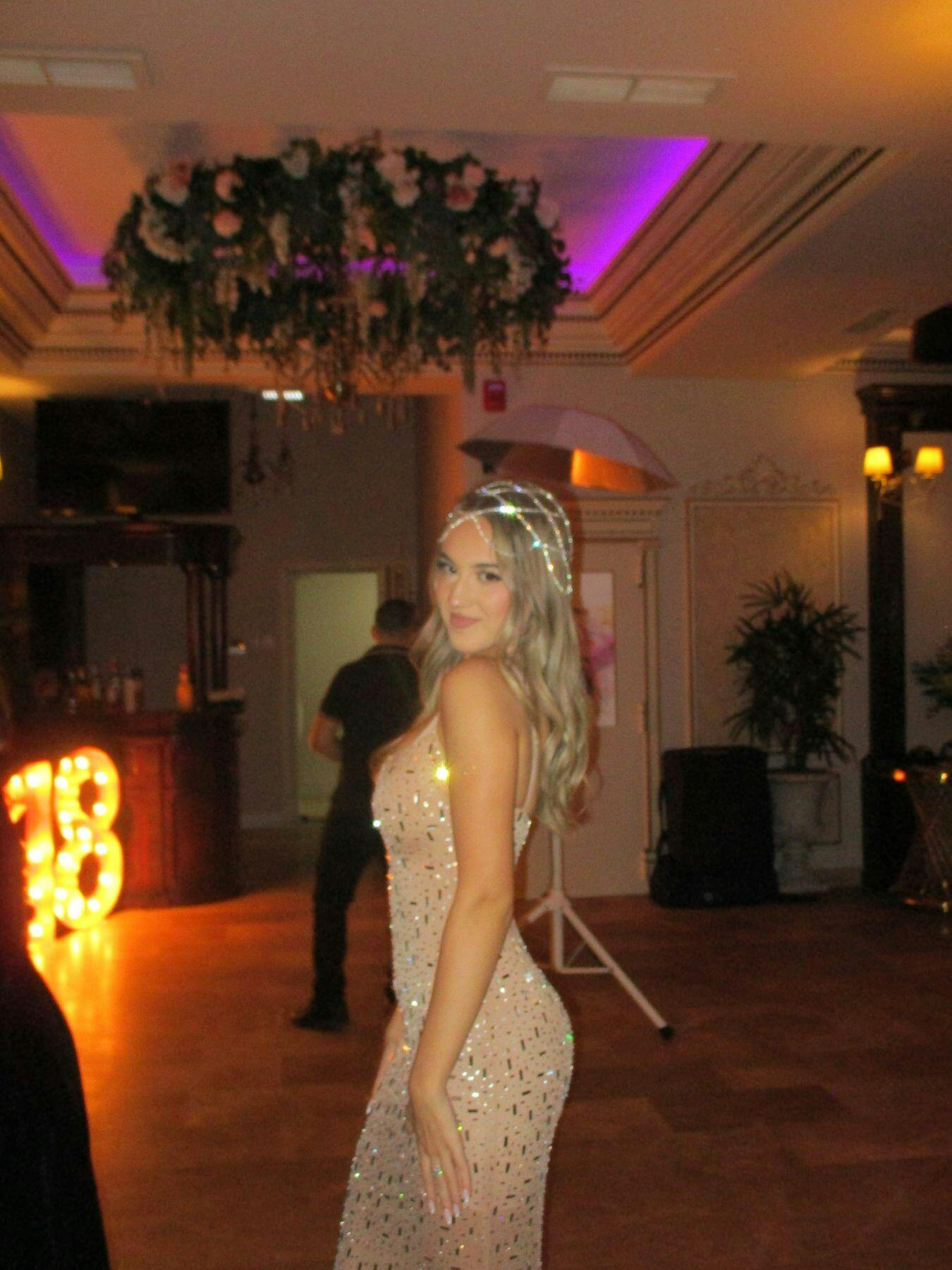 A stunning beige cocktail dress with resort sparkling style. This black mesh maxi, encrusted with crystals, offers a glamorous look for any event. This breathtaking cocktail dress perfect for a resort sparkling style. This floor-length black mesh gown, adorned with shimmering crystals, exudes glamour and sophistication for any upscale event.
